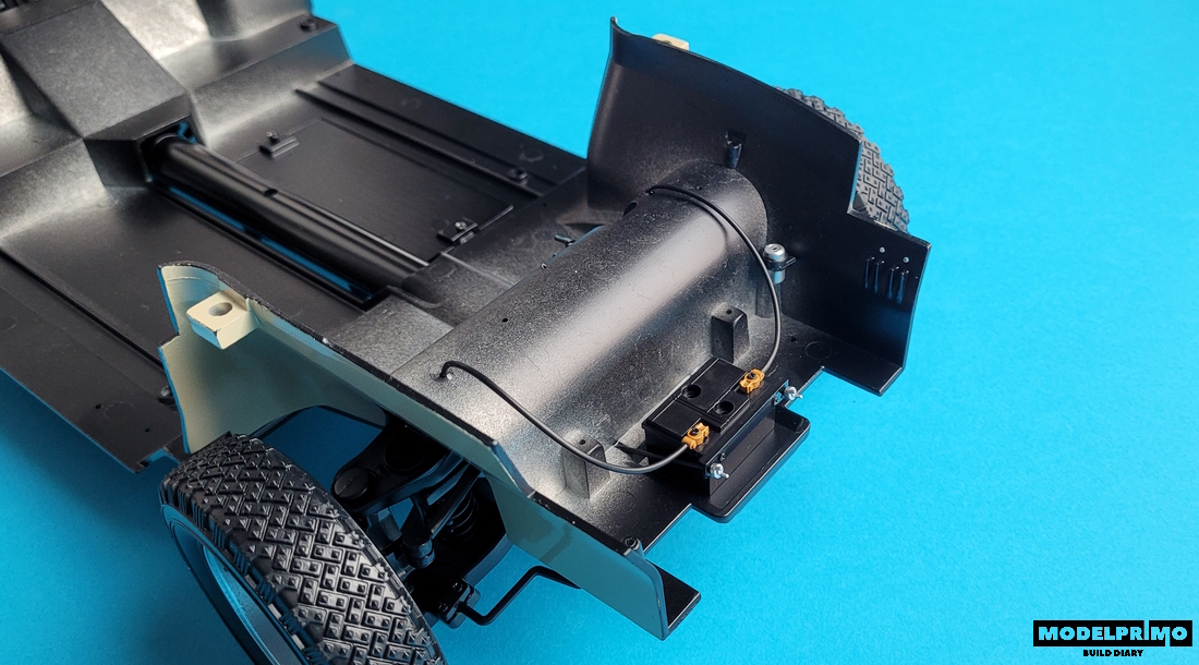 The battery goes into its place in the front of the car just like the tank, everything has been thought out down to the smallest detail, e.g. the handle is connected with wing screws which looks like a real mount.