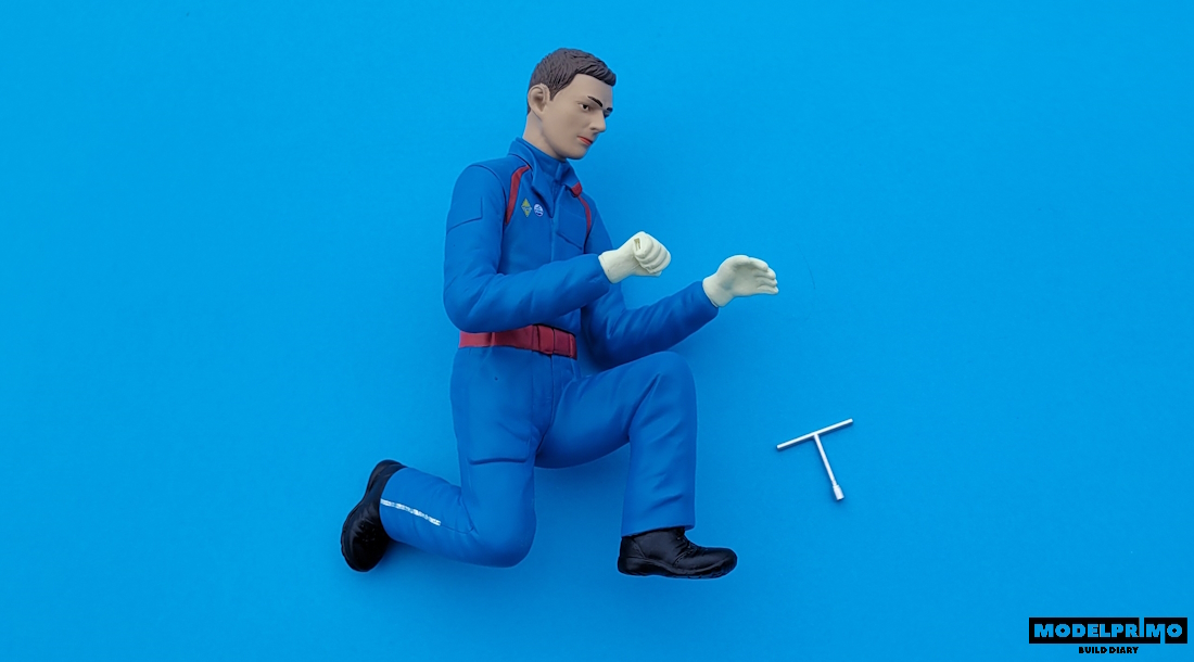 Kneeling mechanic figure with wheel wrench.