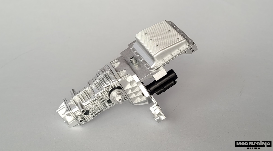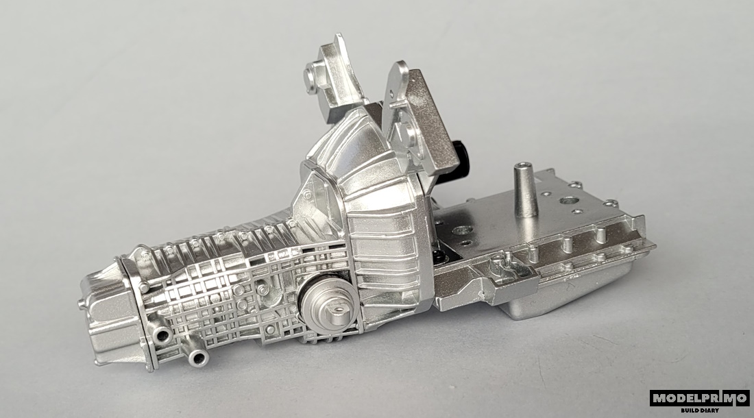 Do przygotowanej wcześniej skrzyni biegów przykręcamy kolejne elementy zawarte w tym numerze, skrzynia zostaje bezpośrednio połączona ze spodem korpusu silnika a także rozrusznikiem.