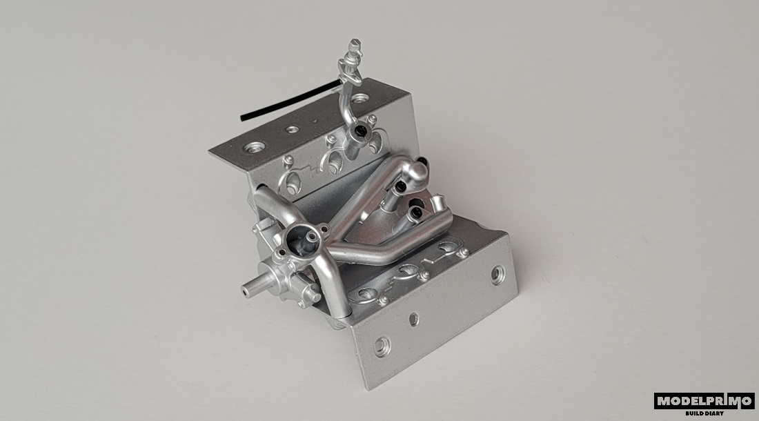 Pompa zawiera również zestaw rurek wchodzących w blok silnika.