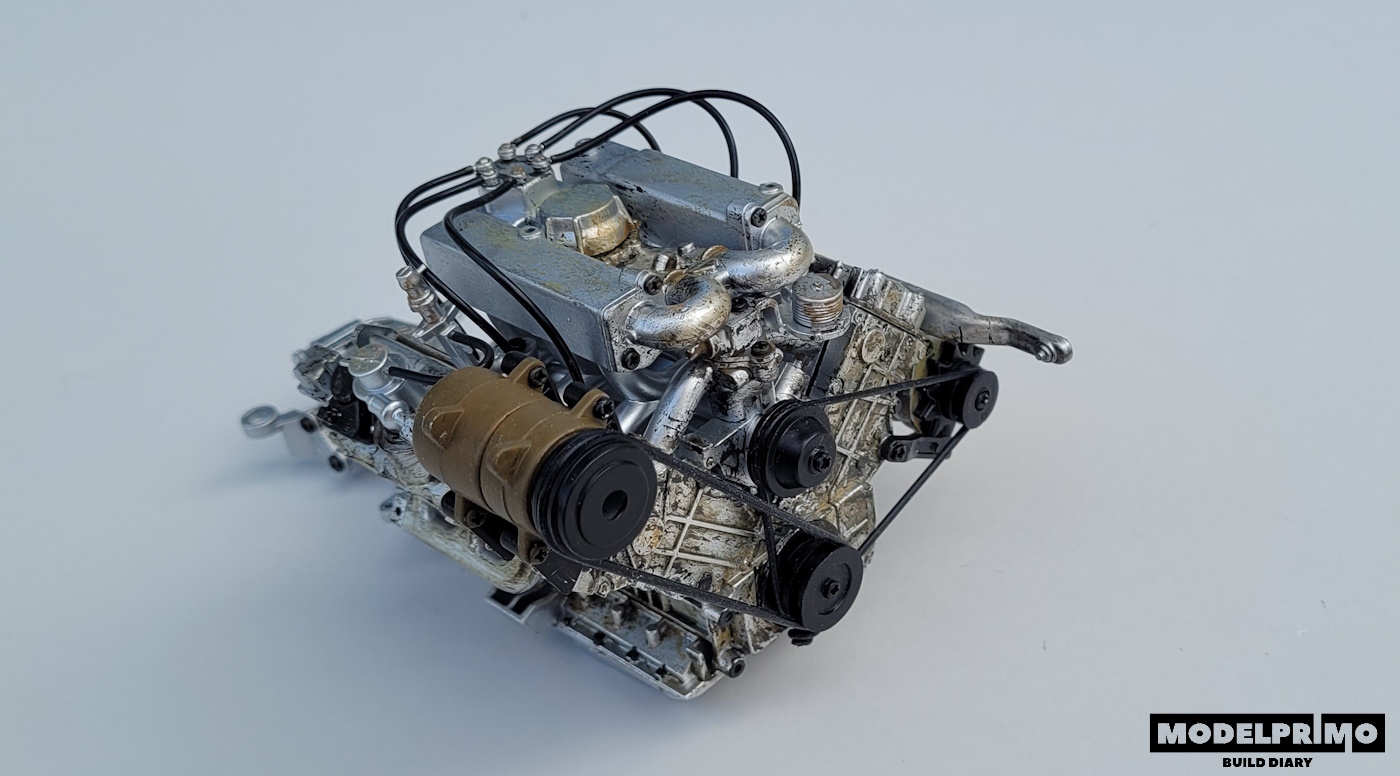 Po założeniu kół pasowych postanowiłem, że to jest ten moment aby pomalować pewne detale i takim sposobem pod czarny pędzel wpadły wszystkie koła, a za nimi kolejne elementy, sprężarka, alternator i ogólnie silnik. Przed malowaniem był zbyt monotonny, mało szczegółowy. Jak dla mnie pomalowany silnik stał się bardziej autentyczny.