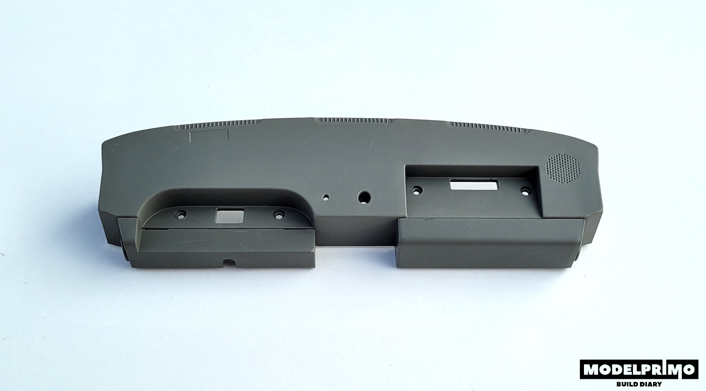 Na początek mocujemy panele z przodu deski rozdzielczej, na lewym panelu opierać się będzie daszek z zegarami.