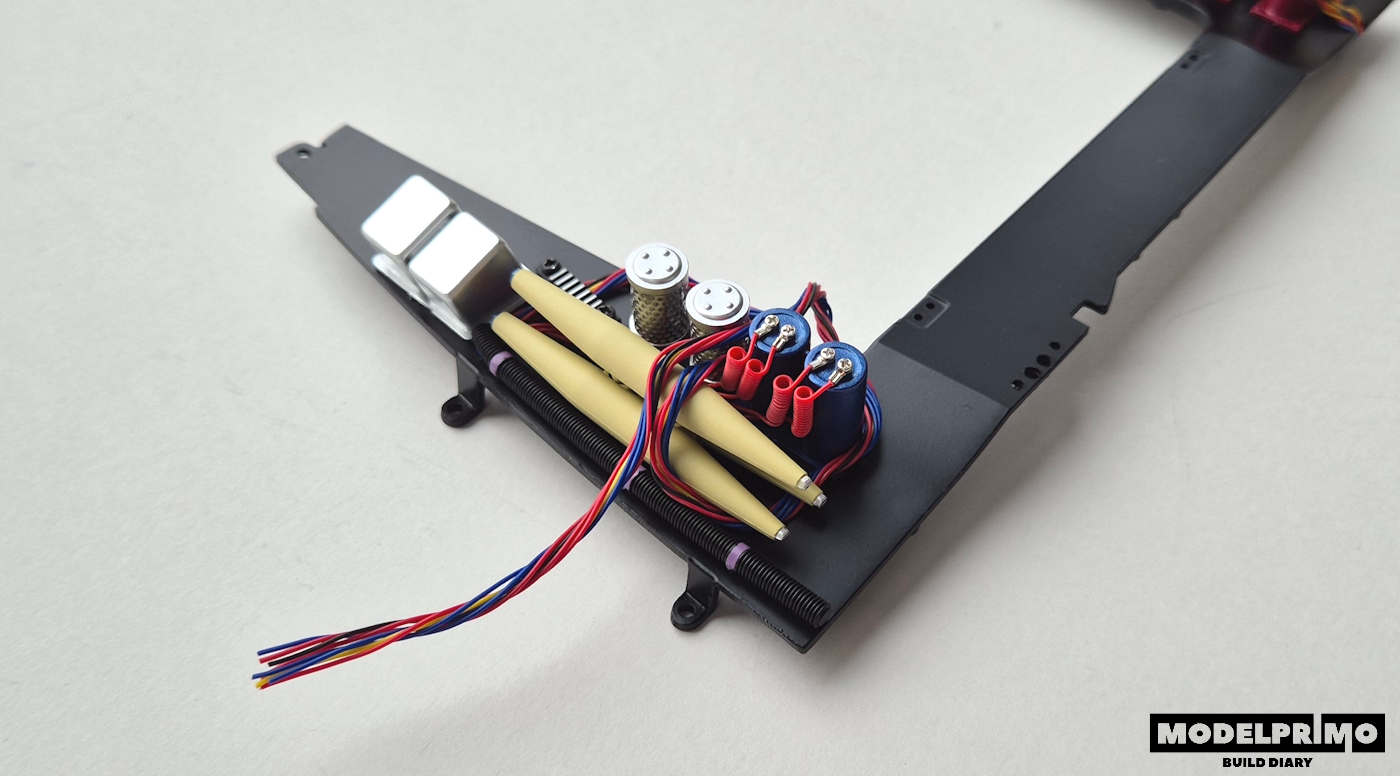 Ciekawe i fajne elementy, szczególnie cylindry, na które zakładamy stalowe siatki i czerowne przewody na sprężynach, które mocujemy do stojacych kondensatorów.