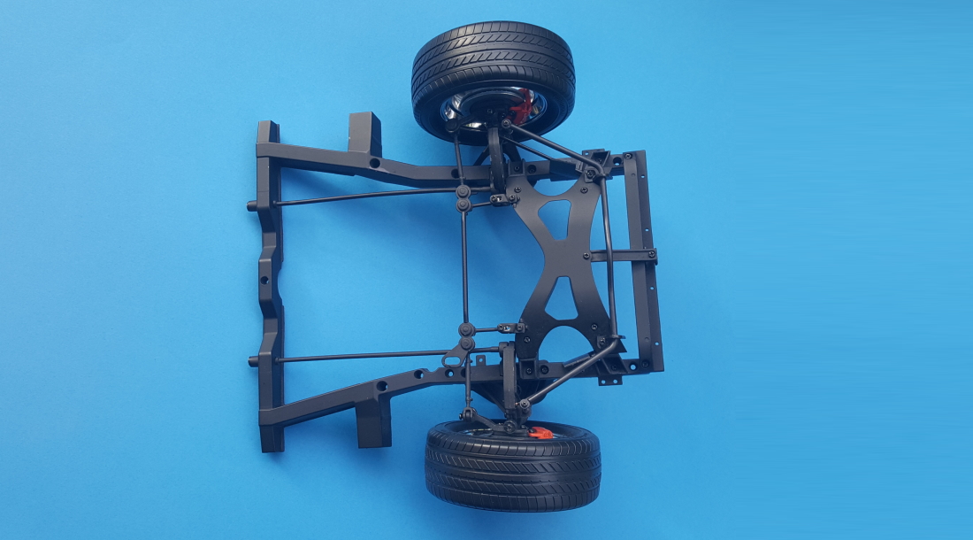 Złożone koło przykręcamy do prawej przedniej piasty, całość zamykamy srebrną zaślepką. W ten sposób przednia część ramy otrzymuje solidne podparcie obu kół.