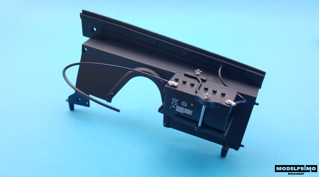 A teraz czas na montaż akumulatora, ten element jest naprawdę świetny, dzięki długim bolcom - drążkom gwintowanym, wygląda jak prawdziwy, przypomocowany do komory silnika.