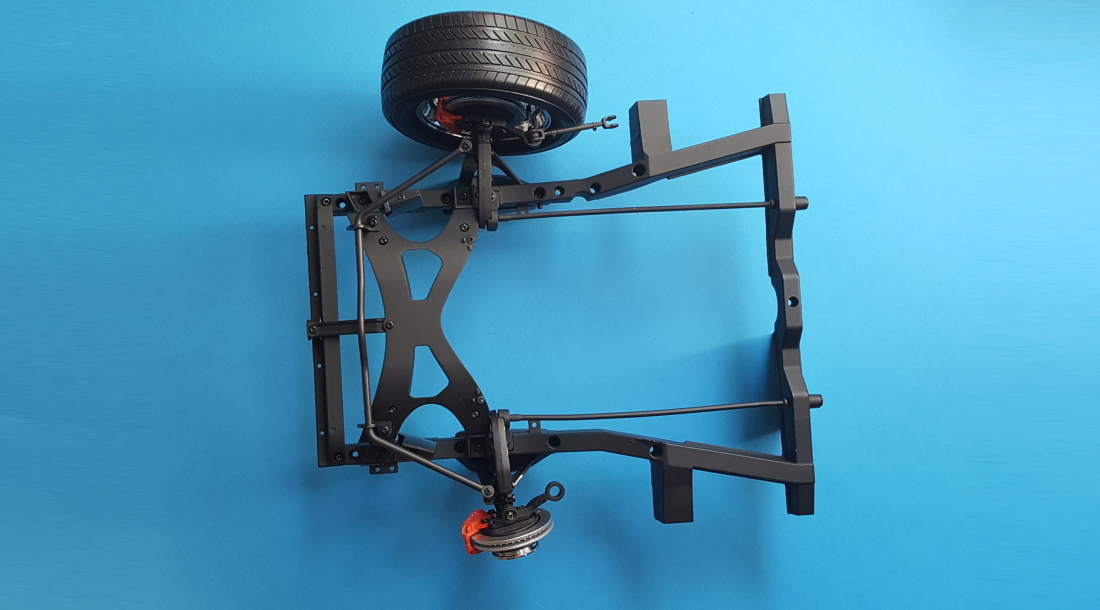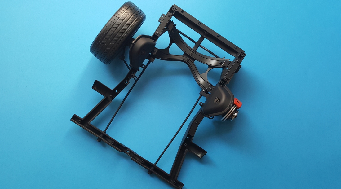 Powracamy do ramy, na której jest już zamocowane jedno koło. Przykręcamy zaślepki i pozostałe elementy układu zawieszenia spinając drugi kompletny zestaw zawieszenia prawego koła z ramą. Na koniec dokręcamy krzyżową osłonę silnika razem z drążkami stabilizacyjnymi.