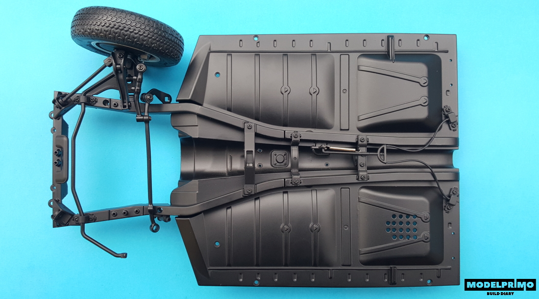 Zaczynamy od przykręcenia wzmocnień i podpory wału. Dodatkowo montujemu mechanizm odciągający hamulec ręczny ze sprężyną, który łączymy przewodami ze wspornikami przewodów hamulcowych.