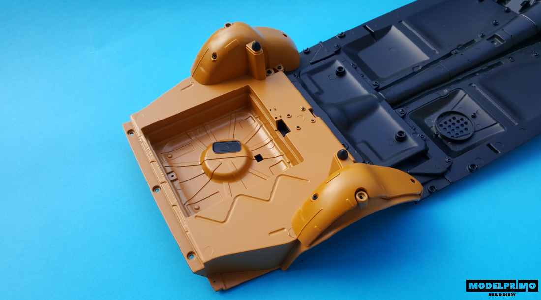 Obracamy model i przykręcamy wzmocnienia będące kontunuacją ramy podwozia.