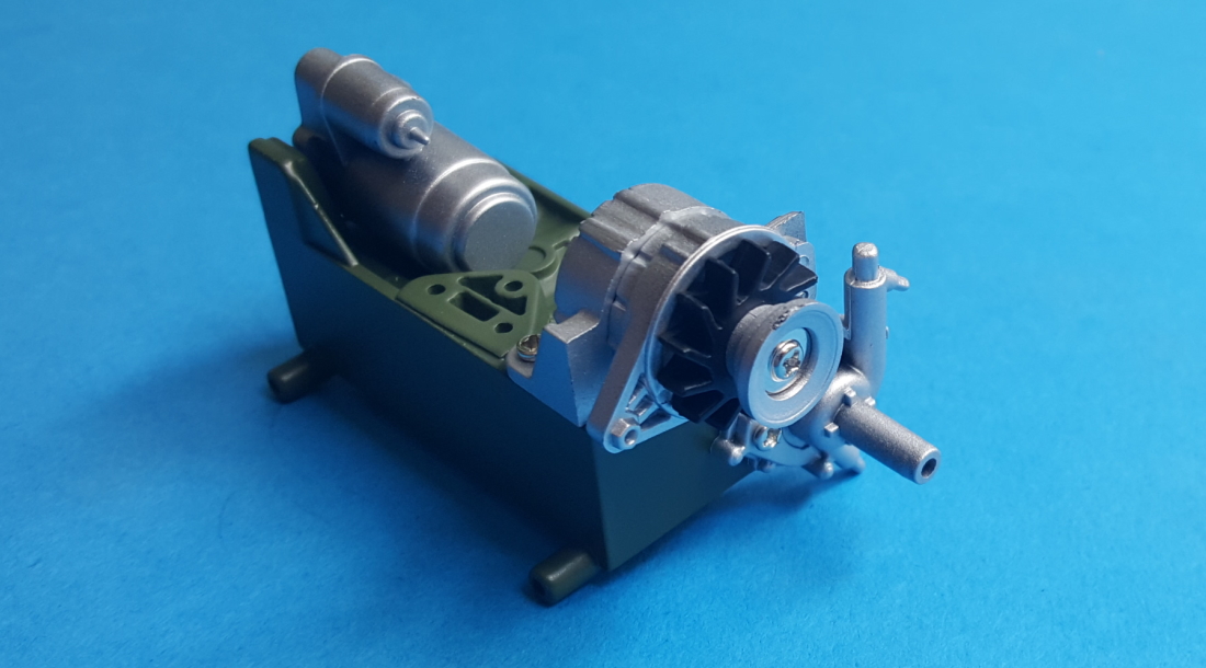 Montaż tego etapu nie powinien sprawić żadnego problemu, elementy dobrze do siebie pasują. Odkładamy pół silnika z zamocowanym alternatorem, częścią rozrusznika i pompą wodną.