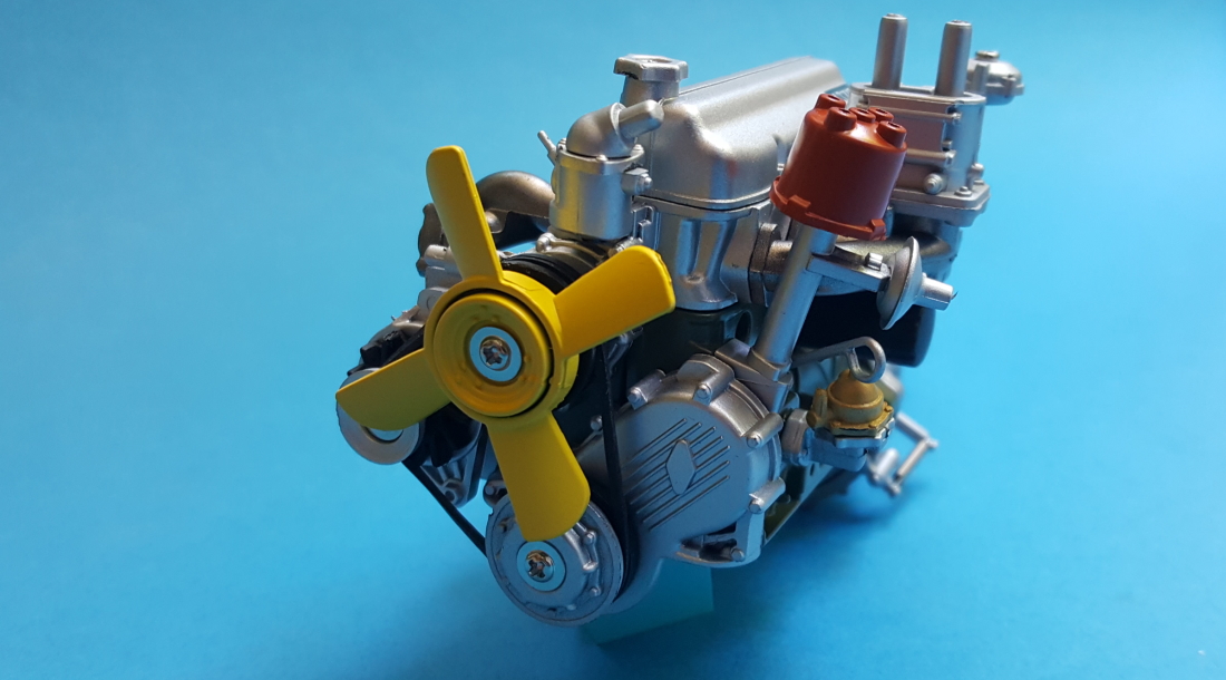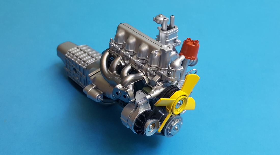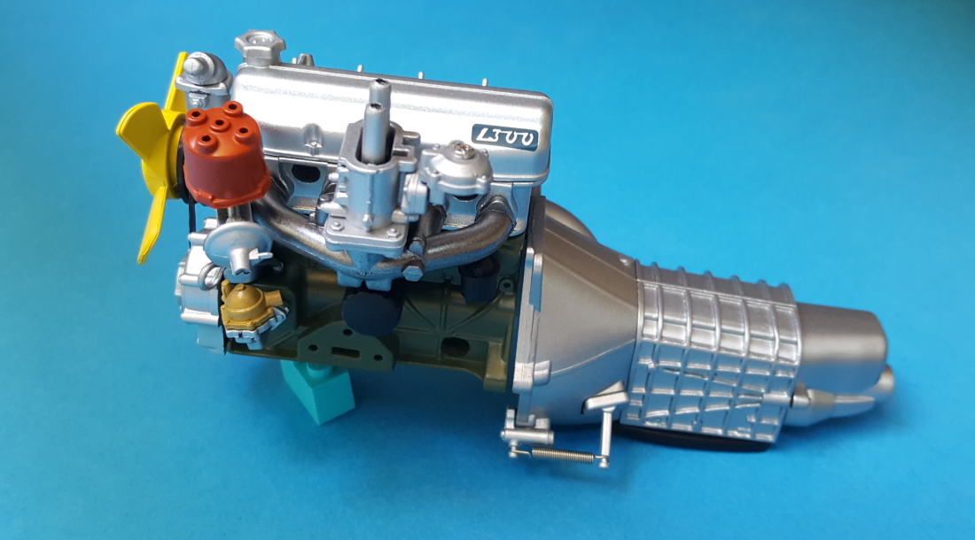 Natępnie przykręcamy oba bloki silnika razem z kompletną skrzynią. Na koniec zakładamy pasek klinowy na koła pasowe. Teraz całość prezentuje się już całkiem fajnie. Brakuje jeszcze miski olejowej i kilku elementów na silniku.
