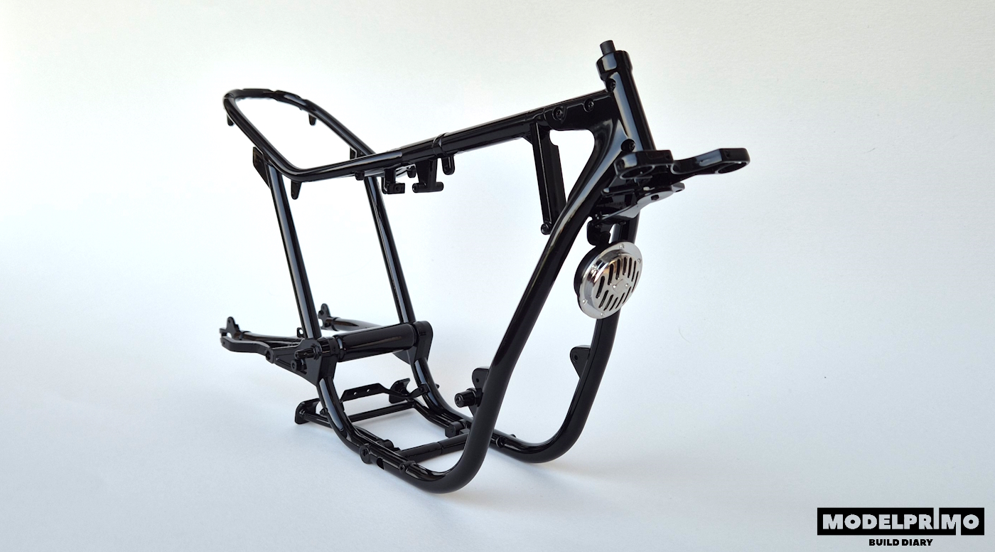 Zaczynamy od zamontowania dolnego mocowania przedniego koła, pod którym montujemy klakson.