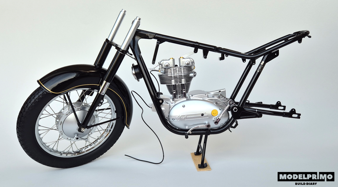 W drugim kroku łączymy przednie koło z amortyzatorami w osi ramy, po tym zabiegu mamy już stojący spory kawałek motocykla, który wygląda niesamowicie :)