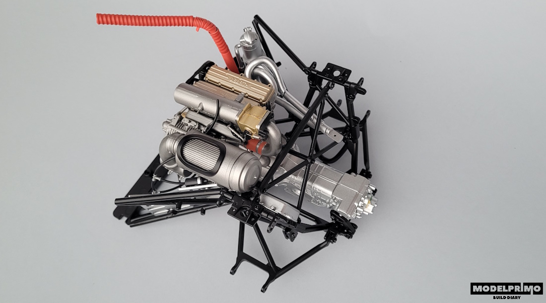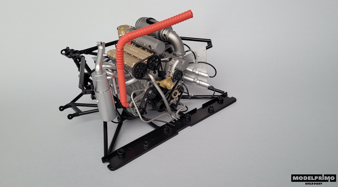 Mocujemy wsporniki do silnika i skrzyni, dzięki którym łączymy jednostkę napędową z ramą, jednocześnie spinamy wskazane przewody gumowe z silnikiem .