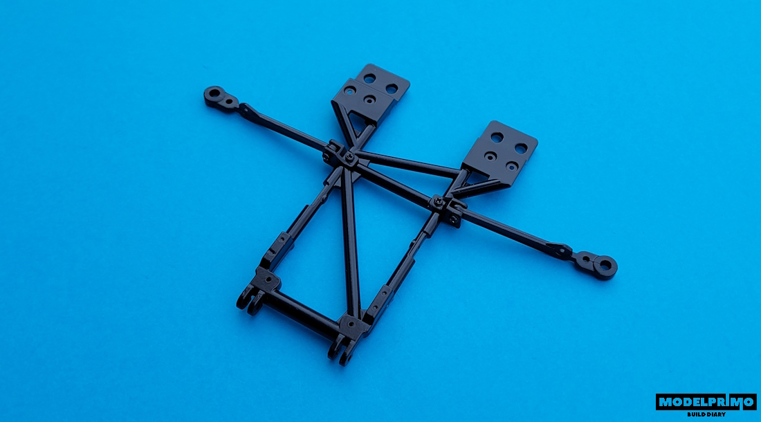 First, we connect the suspension arms to the lower frame.