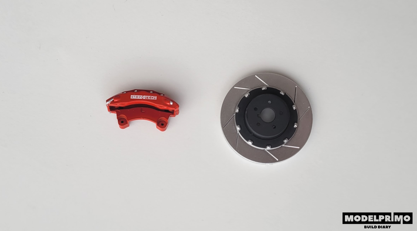 Na ten moment skręcamy tylko obie części tarczy hamulcowej, a także składamy/zaciskamy czerwony zacisk STOP TECH.