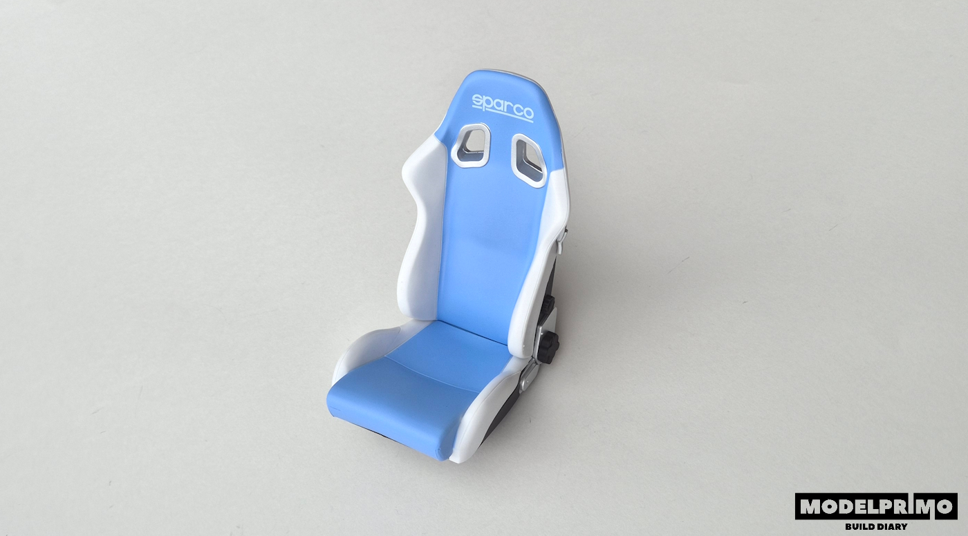 Łączymy siedzisko z oparciem, na gotowo fotel prezentuje się dość ciekawie, z nadrukiem SPARCO i detalami, takimi jak elementy regulacji wygląda bardzo realistycznie.