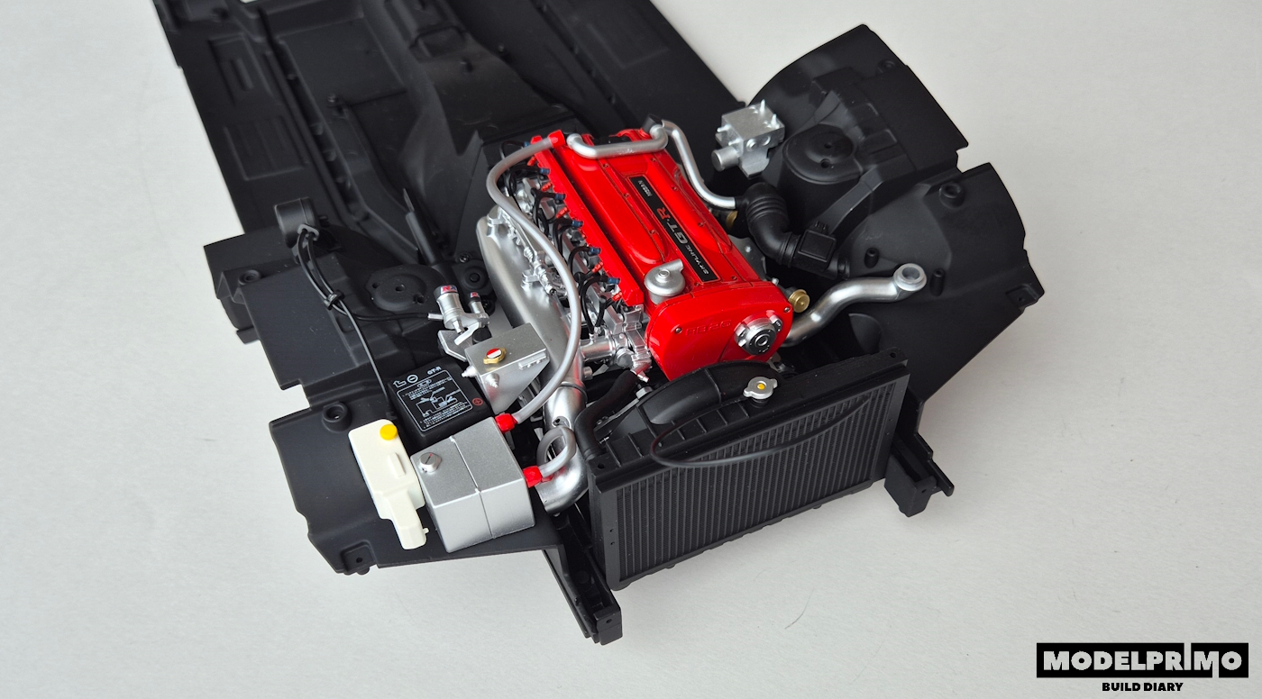 Dodatkowym krokiem milowym w budowie Nissana jest założenie silnika w miejscu docelowym, a także chłodnicy z wentylatorem.