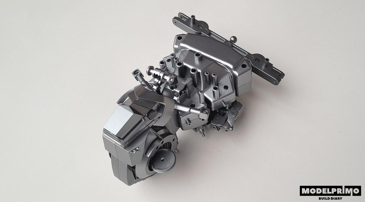Uzupełniamy miednicę kolejnymi dodatkami, a także amortyzatorami z numeru 26. W tym momencie całość zaczyna przypominać silnik sporego motocykla :)