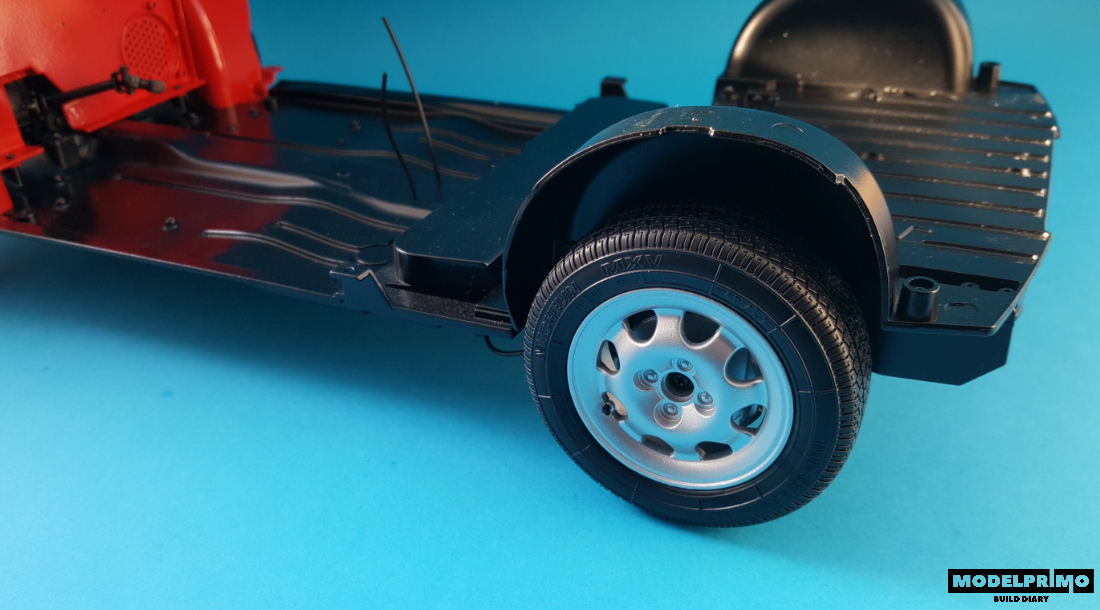 Po założeniu opony na felgę, gotowe koło przykręcamy do piasty tylnego lewego zawieszenia.