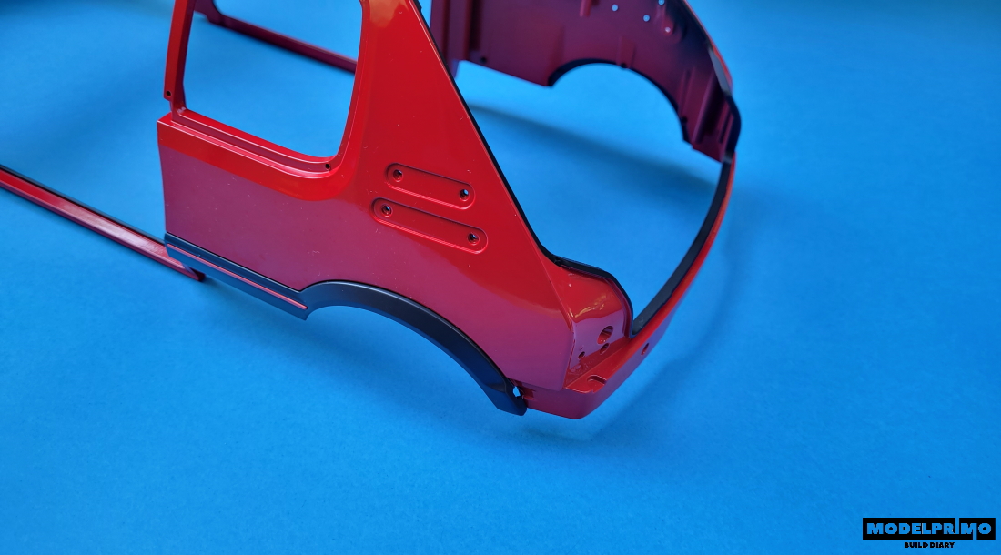 Zaczyamy od umieszczenia czerwonych listew wewnątrz nadkoli - bolce są dość mocno spasowane i dobrze zdrapać z nich lakier.