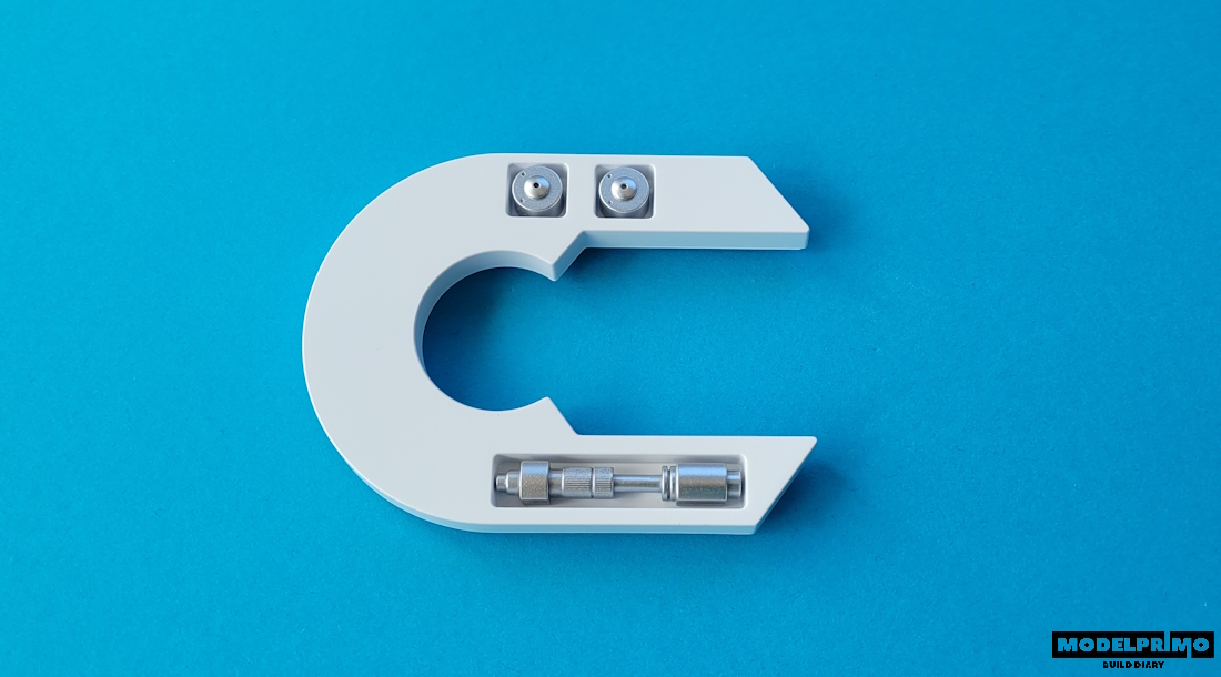 Zaczynamy od zamontowania stabilizatora i smarowniczków na elemencie głównym.