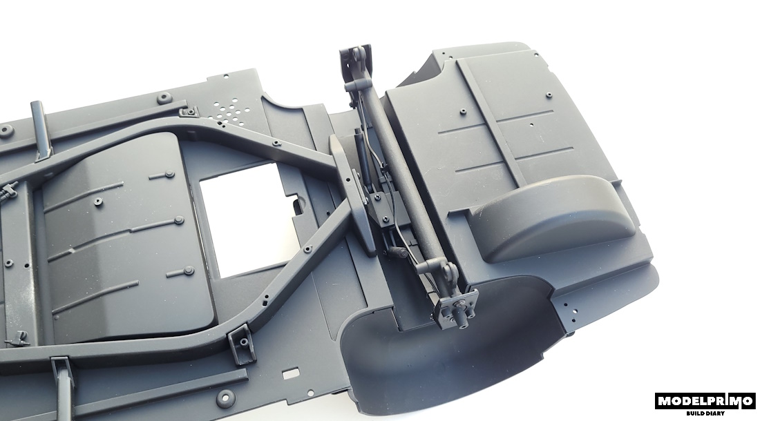 Kontynuujemy montaż tylnego zawieszenia, dodając oś tylną ze wspornikami i przewodem hamulcowym połączonym na trójniku.
