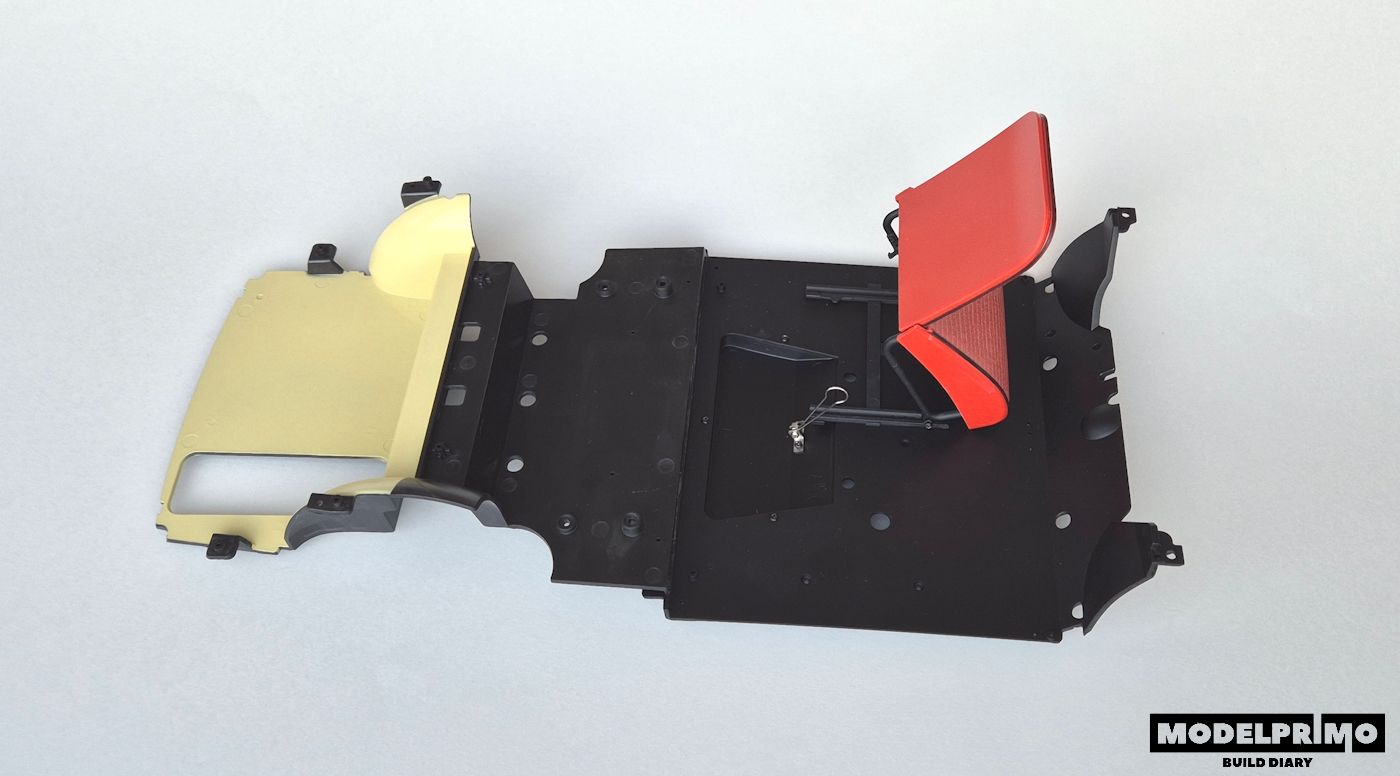 Dołączamy tylną część wewnętrznej podłogi do części środkowej, oprócz tego mocujemy stalowe jarzmo pasów bezpieczeństwa.