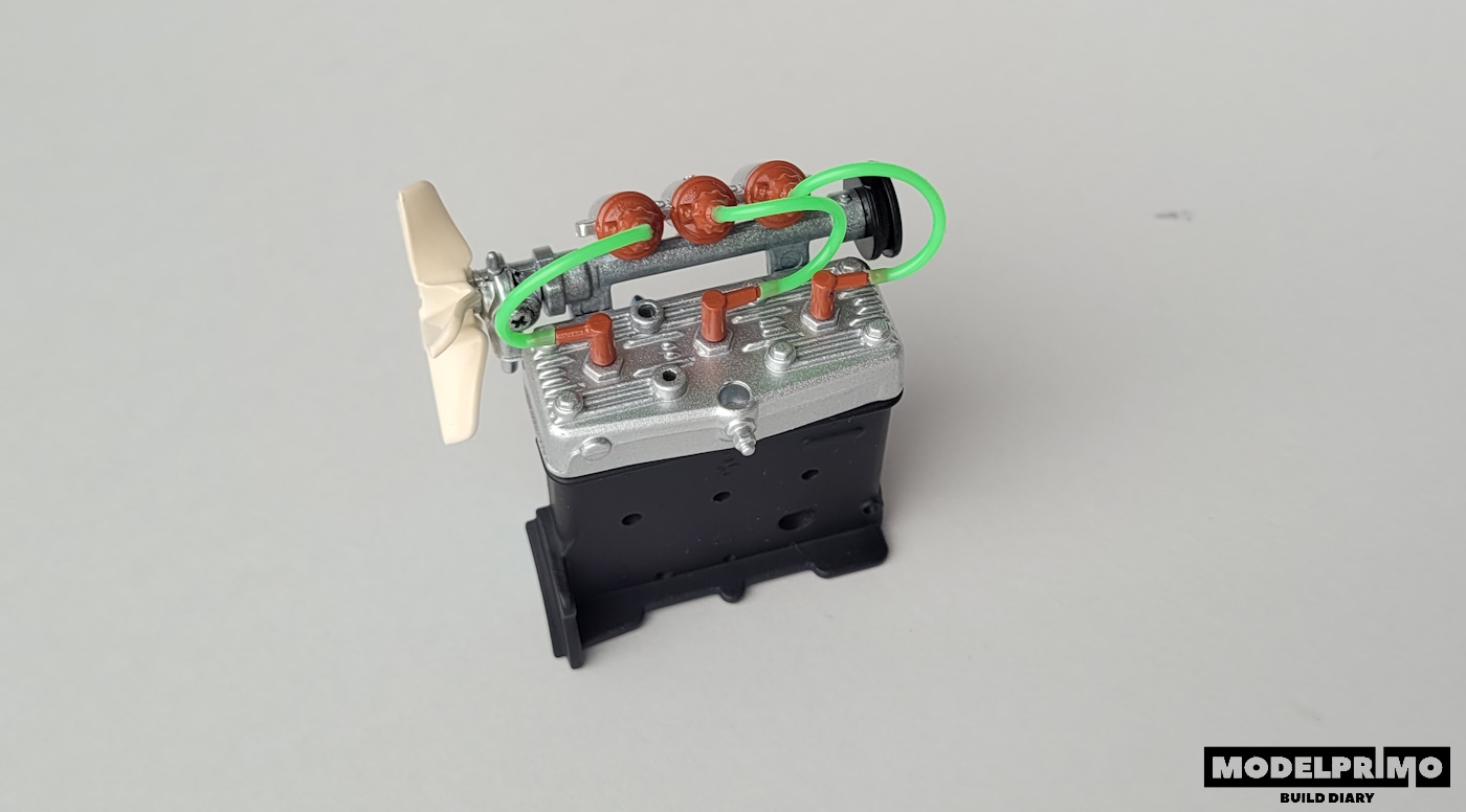 Głowica silnika, wałek pompy wody, korpus pompy wody, wentylator, koło pasowe #1, koło pasowe #2, zespół cewek zapłonowych, końcówka cewki (x3), fajka świecy (x3), przewód zapłonowy, połowa bloku silnika, mocowanie.