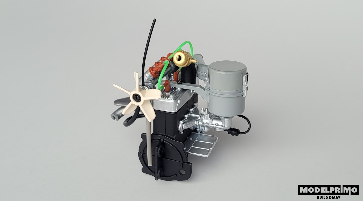 Po dołożeniu drugiej połowy bloku wraz z kolektorem, silnik nabrał kształtów. Do tego zestawu montujemy również aparat zapłonowy usytuwany w dość dziwnym miejscu, termostat, mniejsze elementy i przewody.