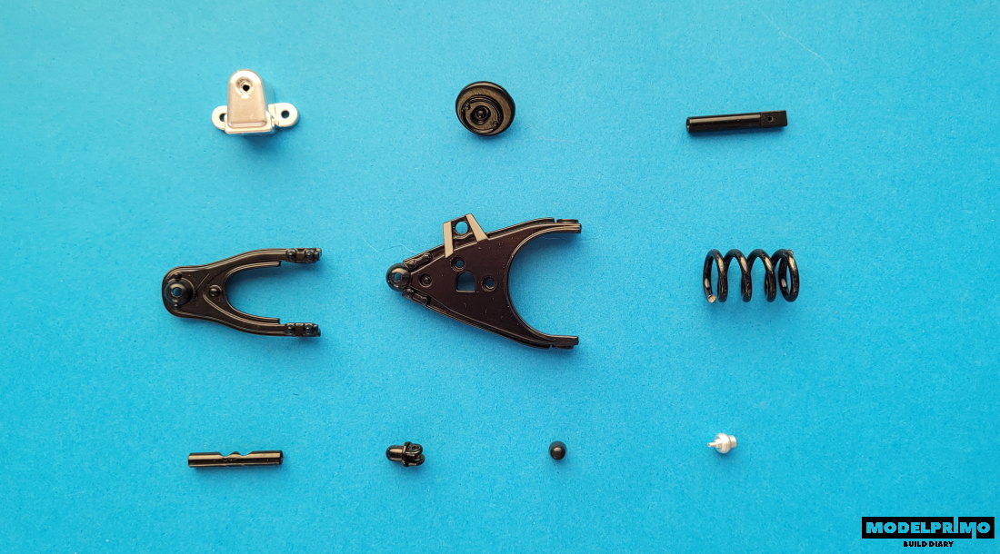 Rama przedniego zawieszenia, sprężyna, odbojnik, dolne lewe ramię, wspornik sprężyny, dolny czop osi, bolec, wspornik górny, końcówka wspornika.