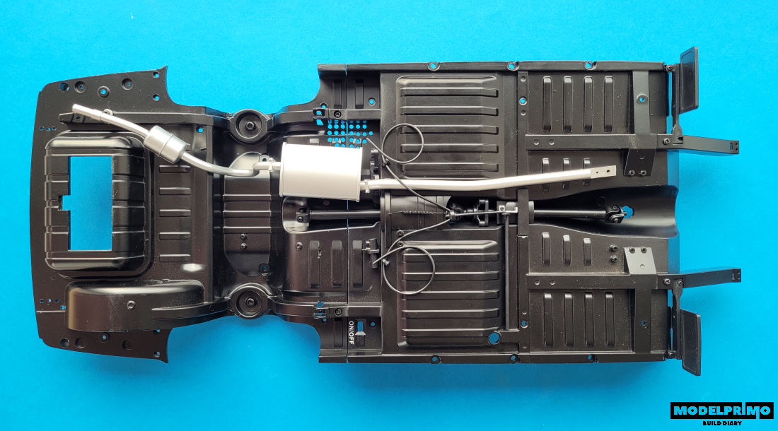 Spinamy cięgna, zakładamy sprężynę i podłączamy linki, które będą połączone z tylnymi kołami. Linki warto podkleić kropelką kleju błyskawicznego.