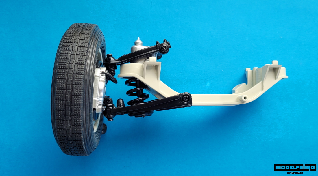 Mocujemy również górne ramie zawieszenia, którym spinamy koło z zawieszeniem.
