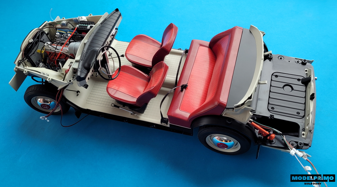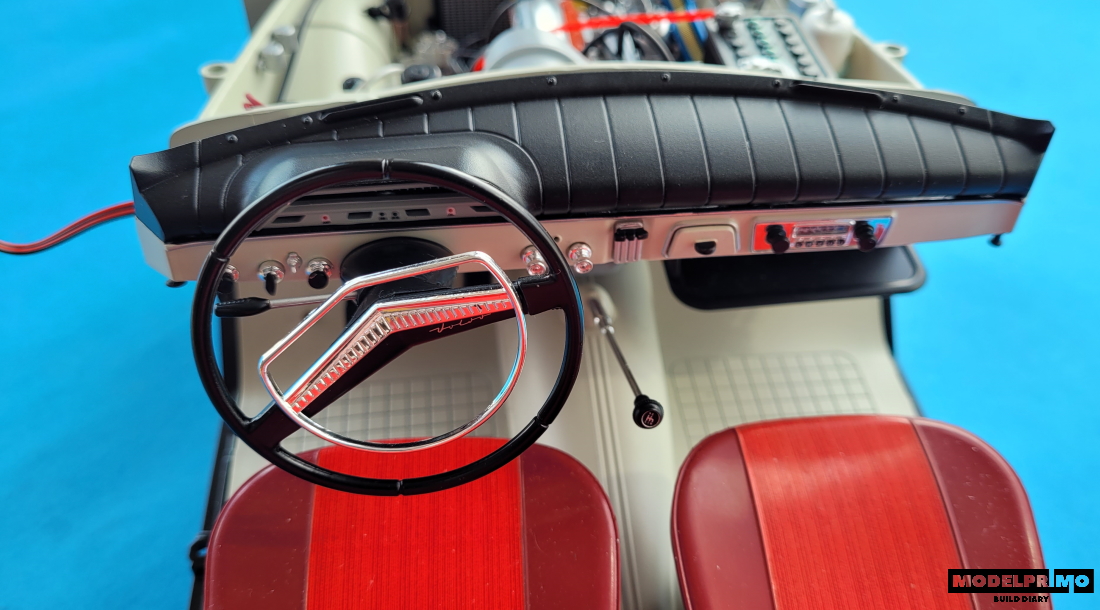 I tak, poza zamocowaniem deski rozdzielczej, należy dokładnie połączyć wszystkie przewody przy silniku, włączniki, serwo hamulca, elementy oświetlenia deski elektrycznej czy kierownicę. Poza tym łączymy chłodnicę z obiegiem i przykręcamy osłonę pod silnikiem.