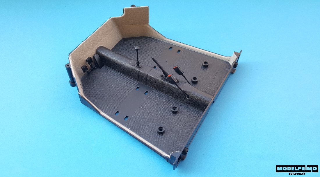 We start with the assembly of a set of pedals and then the handbrake levers with side elements and the gear stick.Finally, we screw on the seat belt buckles.